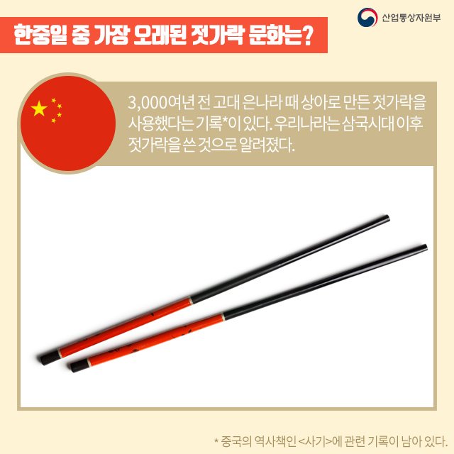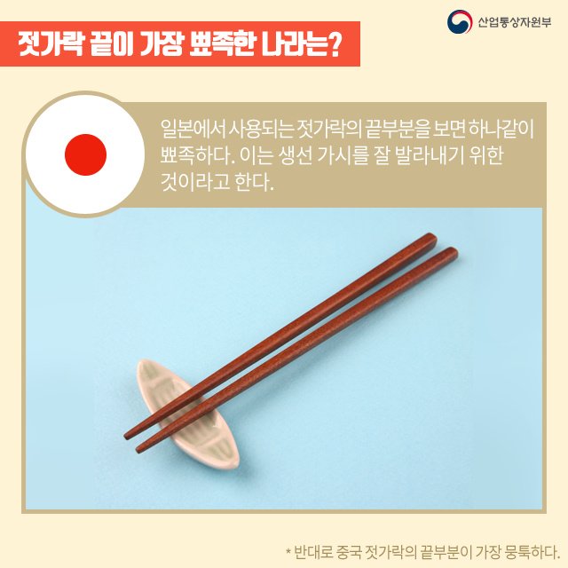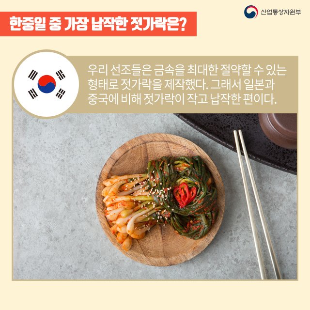 사실상 젓가락은 한·중·일 공통 문화 언어라고 해도 과언이 아니다. 한국 젓가락과 일본 바시(箸), 중국 콰이즈(筷子)는 닮은 듯 다르다. 제각각의 문화적 특징을 갖고 있다. 무엇보다 각 민족의 식문화에 적응하면서 차이를 낳은 것이다. 특히 음식 재료와 식사 방법의 차이도 젓가락 사용법이 달라진 이유로 꼽힌다.