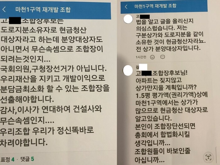 정리하면, '현금청산 대상자'인 고씨는 조합장 선거에 나섰을 뿐 아니라, 후보 등록 일주일 전인 ‘공식 선거운동 돌입 이전부터 ‘사전 선거운동’ 논란을 일으킨 인물이다.