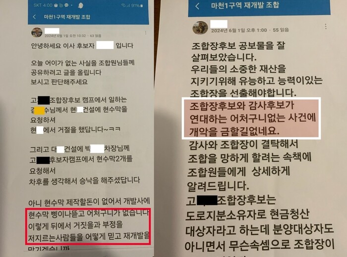 재개발 업계 관계자들은 이에대해 기자와의 전화연결에서 "재개발 역사 상 없던 일이 마천1구역에서 (이번 선거에) 유독 벌어지고 있어 선거가 끝나도 조용히 갈것 같지 않다"며 "상식적이지 않은 일들에 대해 조합원들이 현명한 판단을 해야 한다"고 조언했다.