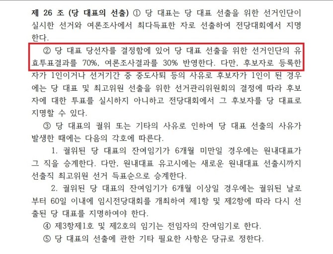 ‘신설항2’은 권리당권의 권한 강화 조항이다. 당원 민주주의를 주창하는 이 대표로선 충분히 시도할만한 가치가 있다. 물론 당직이 아닌 국회직 선거에서 권리당원에게 투표권을 부여하는 게 맞느냐는 논란은 차지하면 그렇다는 얘기다.
