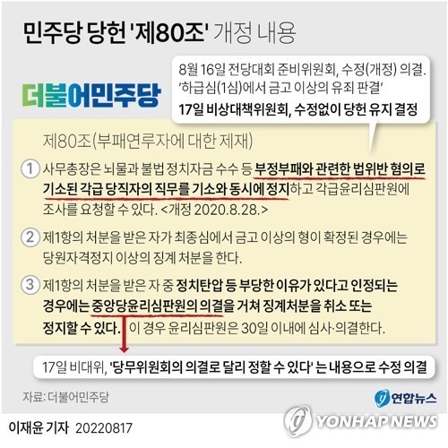 민주당은 ‘당 대표 1년 전 사퇴 규정’(당헌 25조), ‘기소와 동시에 부정부패 연루자 공천 금지 규정’(당헌 80조)를 개정에 나섰다. 또 신설항목도 있다. △당론을 위반시 공천 배제(신설항 1)와 권리당원에게 국회의장 및 원내대표 선거의 투표권 20% 부여(신설항 2) 등의 명문화가 추진되고 있다.