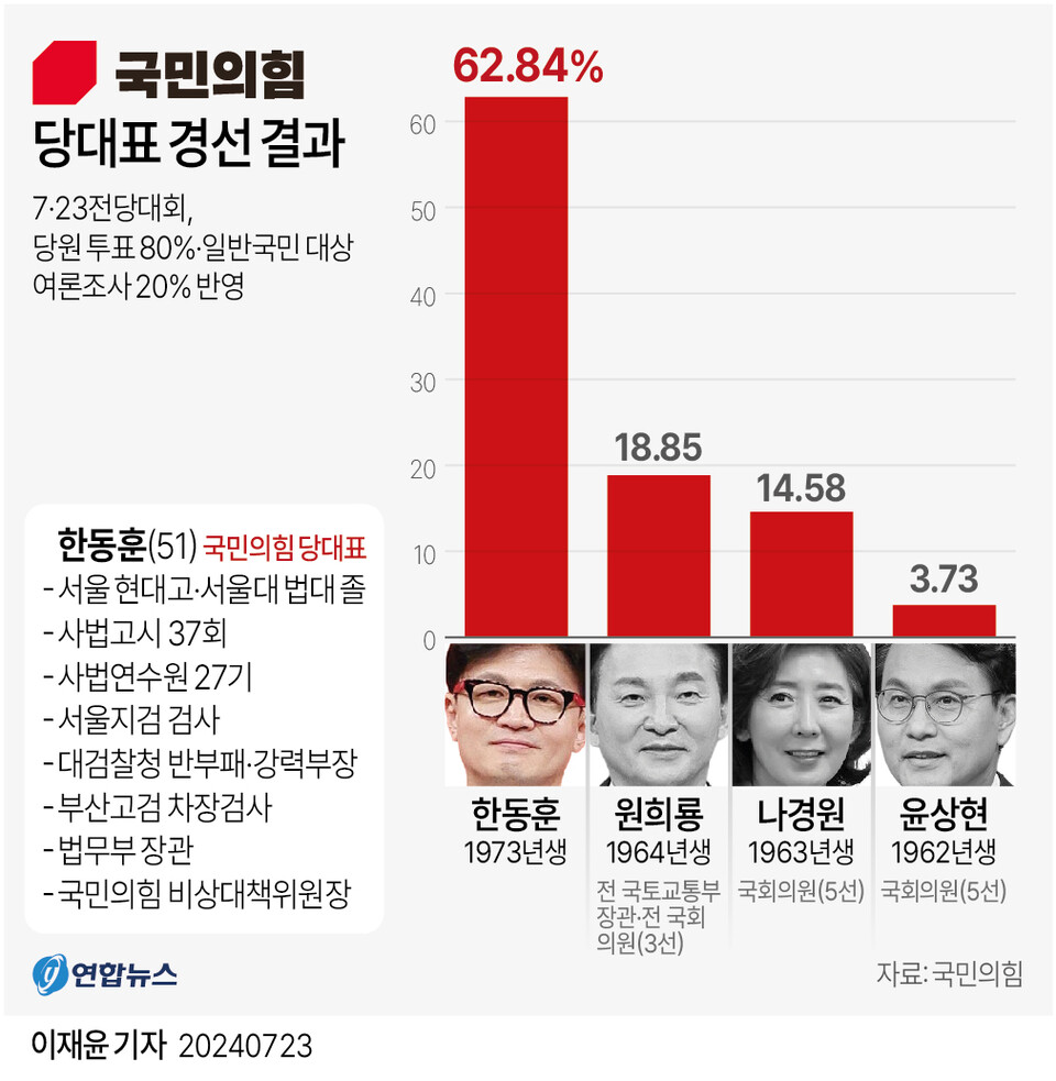 한동훈 신임 대표는 23일 오후 경기 고양 킨텍스에서 열린 국민의힘 제4차 전당대회 대표 경선에서 당원투표와 일반 국민여론 조사를 합산한 결과 62.84%를 득표, 과반을 넘겨 결선투표 없이 당대표에 당선됐다.