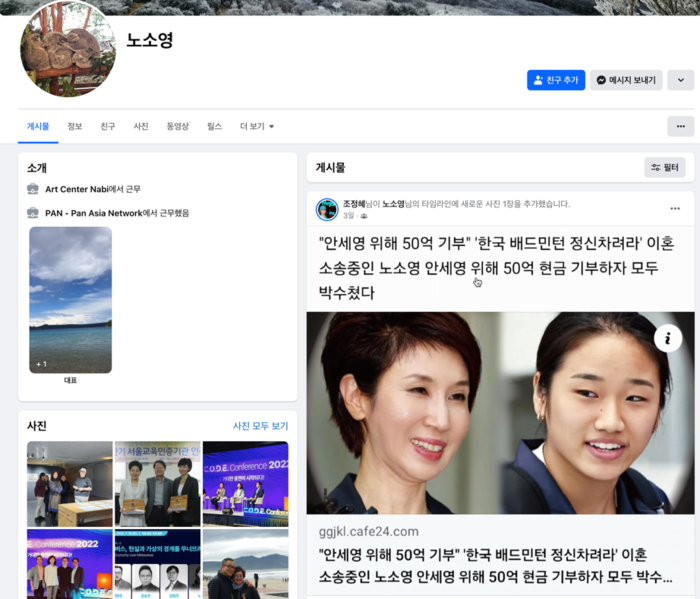 해당 게시글은 출처가 불분명한 ‘지라시’ 게시글이다. 노씨 측은 안세영 선수에게 기부는 물론 후원에 관련한 어떠한 사안도 진행되지 않았다.