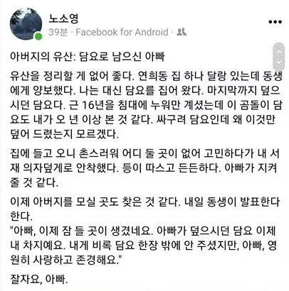 한편, 노씨 측은 2021년 노 전 대통령 별세 이후 사회관계망서비스(SNS)에 올린 글에서 “유산을 정리할 게 없어서 좋다”며 “연희동 집 하나 달랑 있는데 동생에게 양보했다”고 적었다. 노 관장은 “대신 담요를 집어 왔다”며 노 전 대통령이 투평 중 덮고 있던 ‘곰돌이 담요’ 사진을 함께 올렸다.