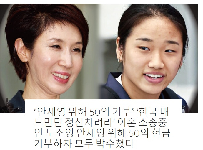 지난달 25일 노소영 관장의 페이스북에 ‘안세영 위해 50억 기부, 한국 배드민턴 정신차려라, 이혼 소송중인 노소영 안세영 위해 50억 현금 기부하자 모두 박수쳤다’란 제목의 게시글이 올라왔다.
