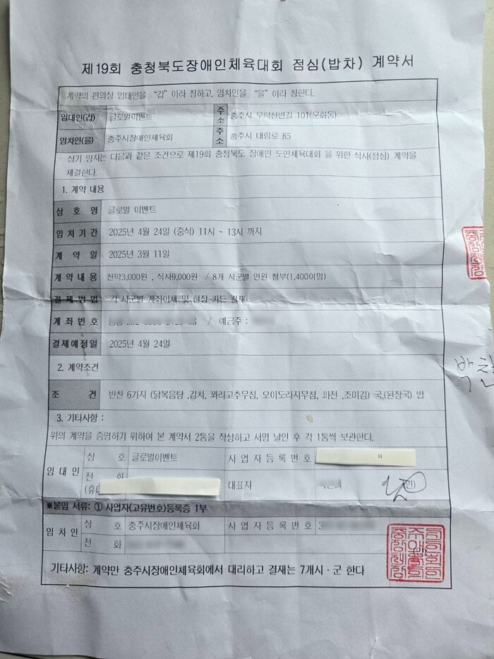또 체육회는 처음에 작성한 계약서는 잘못됐다면서 파기시키고 '계약만 충주시장애인체육회에서 대리하고 결재는 7개 시 군한다'는 기타사항을 추가해 다시 계약서를 작성했다.