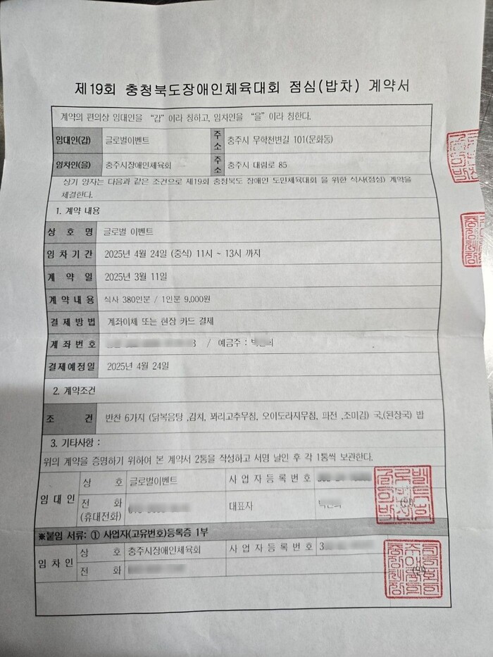 충주시장애인체육회(이하 체육회)는 장애인체육대회 개막식날 불거진 부실 도시락 파문이 일자 개막식 다음날인 4월 25일 오전 업체을 불러 뒤늦게 도시락납품계약서를 작성한 것으로 본지 취재결과 드러났다.