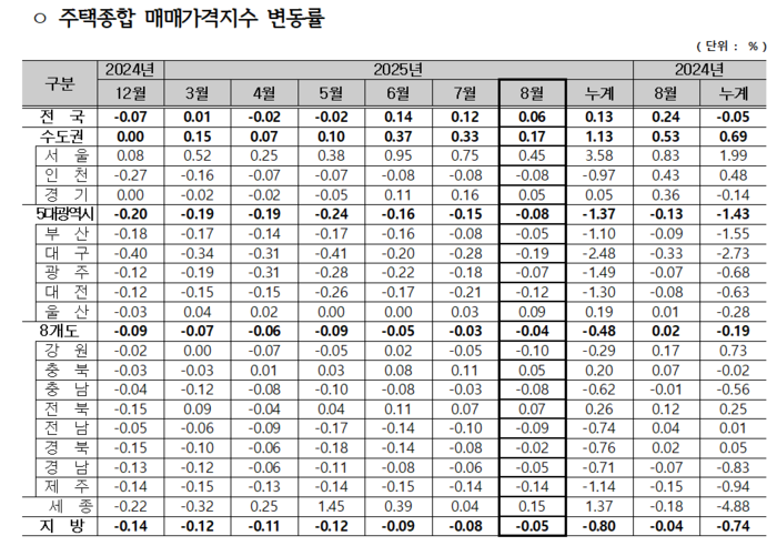 수도권은 매매가격지수가 지난달보다 0.17% 올랐으며, 지방은 0.05% 줄었다.