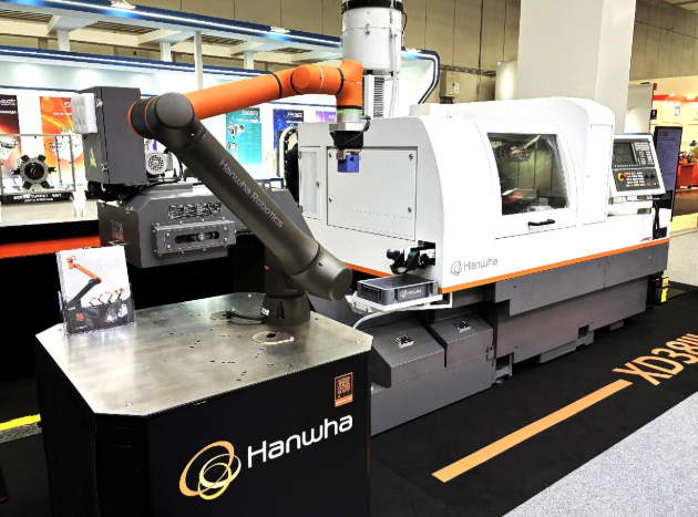 한화세미텍의 XD38III 자동선반 장비에 협동로봇 HCR-14를 네트워크로 연결, 부품을 자동으로 옮기는 작업을 선보인다.