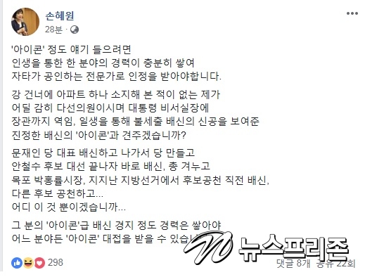 손 의원은 이날 페이스북을 통해 "'아이콘' 정도 얘기 들으려면 인생을 통한 한 분야의 경력이 충분히 쌓여 자타가 공인하는 전문가로 인정을 받아야합니다"라며 "박지원 의원님과 제가 의심하고 있는 목포 바닷가 최고 자리에 올 고층아파트의 건설 계획에 관련된 분들을 할 수 있으면 함께 검찰 조사를 받고 싶다"고 말했다.